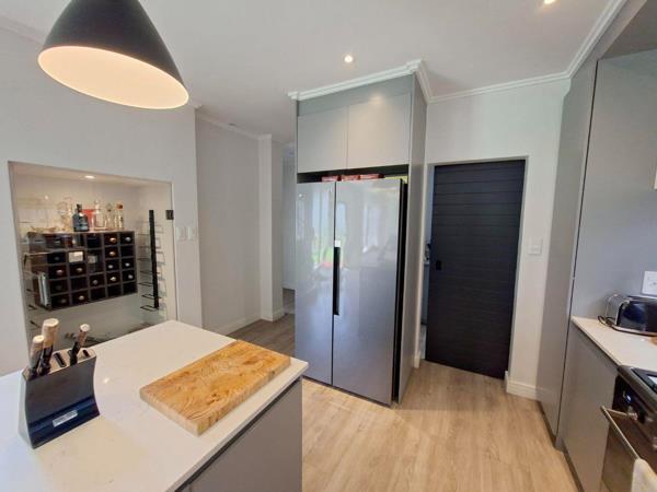 As you enter the home, you are welcomed by a stylish kitchen finished with high end fittings and striking black accessories. The kitchen features a top quality gas stove, ample cupboard space, and a separate scullery with space for three appliances, allowing the main kitchen area to remain sleek and uncluttered.