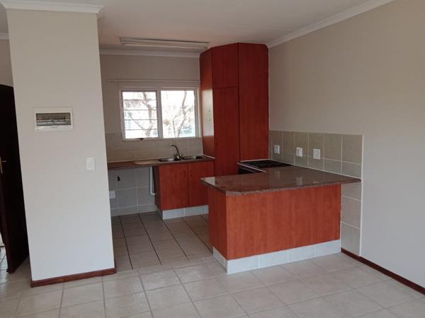 A stylish one-bedroom apartment is available to rent immediately at Annlin Place Lifestyle Village in Sinoville, Pretoria. The unit is fully tiled and includes a bathroom and one parking space. The kitchen is equipped with built-in cupboards, an electric stove and oven, and a washing machine connection.