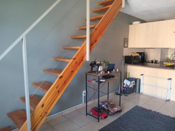 The apartment features a spacious bedroom with en-suite bathroom and build-in cupboard on mezzanine level. The double volume open plan lounge and kitchen area is functional and convenient for daily use and opens up onto a balcony that makes the apartment light & airy. Solar Panels in place for full back-up when there are power outages in the area. Neat and well maintained complex.