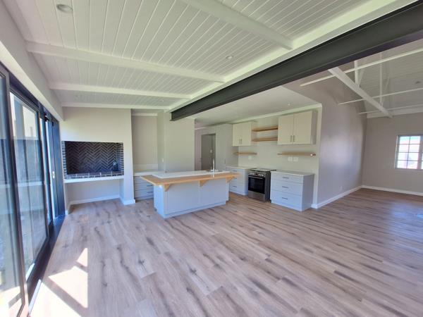 The property features a spacious open-plan living area with a lovely built-in braai, as well as a modern kitchen fitted with a gas stove and a separate scullery. There are three comfortable bedrooms, including a main bedroom with an en-suite bathroom, plus a second family bathroom.