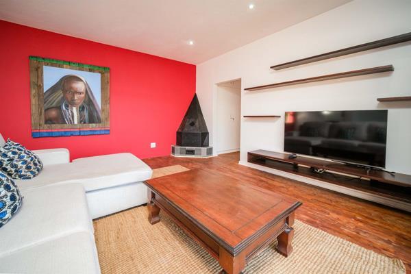 Step outside to a beautifully designed entertainment area, where a sheltered patio offers an outdoor lounge, dining space, and braai area overlooking a lush tropical garden. The sparkling pool, complete with a child-friendly shallow step, adds to the homes appeal as a family-friendly haven.