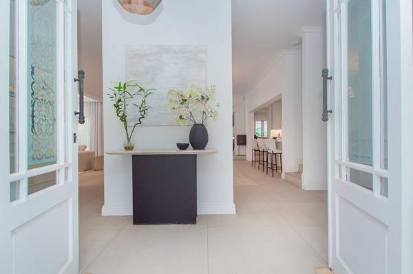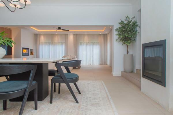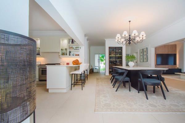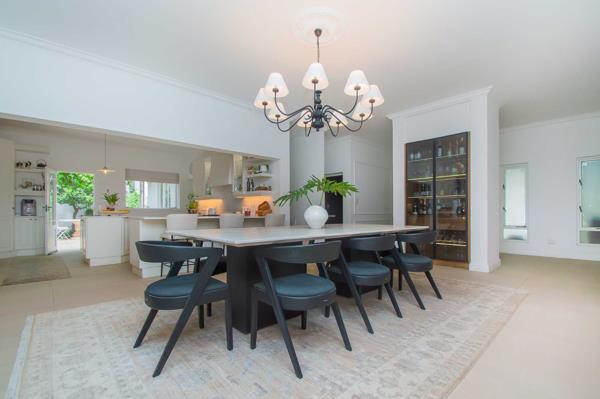The spacious open-plan living areas feature a beautifully designed and well-equipped kitchen at the center of the home, along with generous lounges, dining, and entertainment spaces, perfect for comfortable family living and seamless entertaining. The high-end finishes include imported Italian floor tiles, premium sanitary ware, an impressive solid oak built-in bar display cabinet, and bulkhead lighting, complemented by overhead Stephen Pikus light fixtures that create a warm ambiance for any occasion.