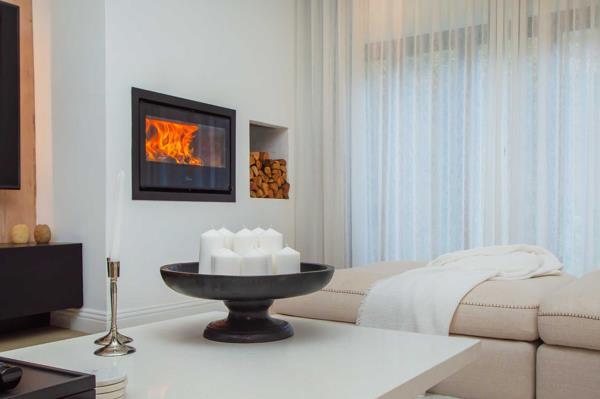 Frameless stacking doors seamlessly connect the living areas to the patio, complete with a pergola for delightful alfresco dining, all while overlooking the serene landscaped garden and heated pool. This design fosters an indooroutdoor experience that enhances summer gatherings. In the cooler months, the home is cozy and inviting thanks to a La Cunza wood-burning fireplace and an efficient smart Signi gas fireplace.