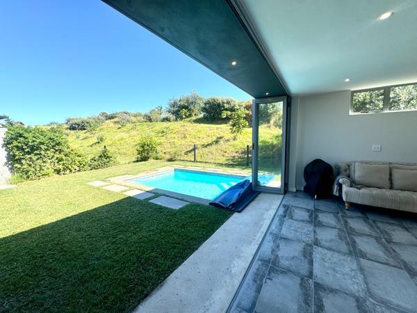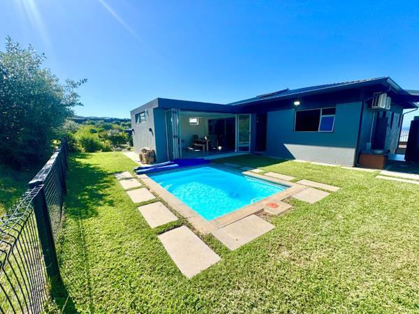 The open plan kitchen, dining and lounge areas flow into the large additional lounge area with sliding doors leading onto the pool. In addition, there is a front patio with lovely sea views.