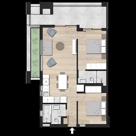 This 51m2 unit has a lovely balcony of 16m2, furthermore, this apartment has 2-bedrooms 2-bathrooms and it will be built with style and comfort according to modern time living. The open-concept design seamlessly connects the living and dining areas, creating an inviting space for relaxation and entertainment. The bedrooms offer ample room for personalization, and the well-appointed bathrooms provide both functionality and aesthetics.