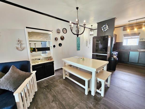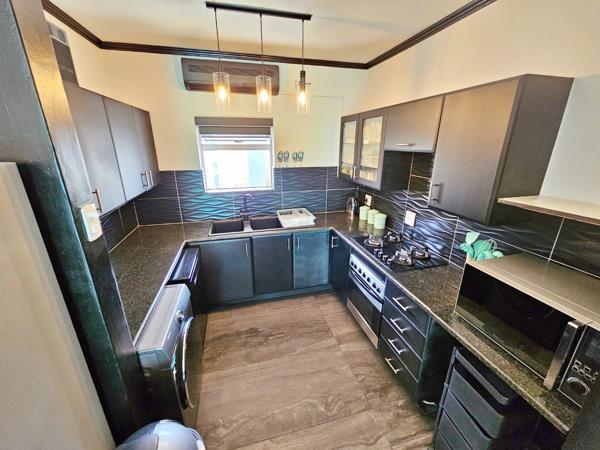 The upgraded unit offers a modern, open-plan layout featuring a lounge and dining area that flows seamlessly into a stylish kitchen with a gas hob, air-conditioning, and ample cupboard space.