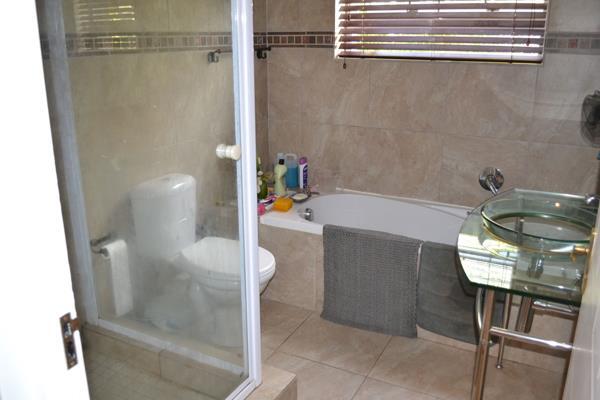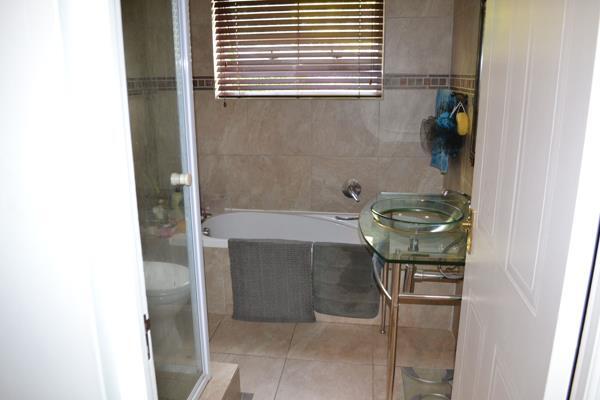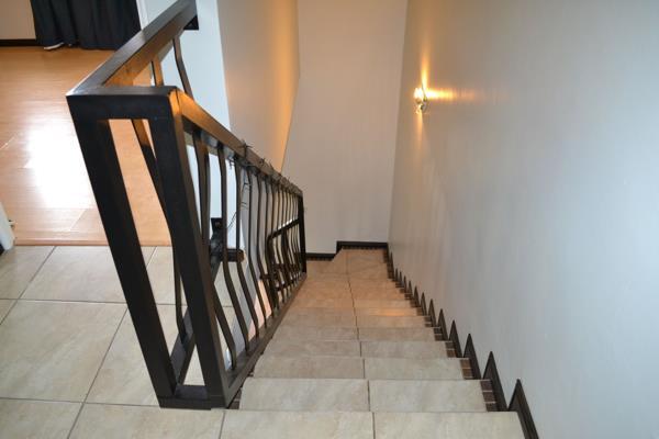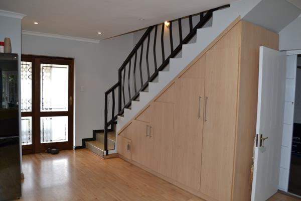 A beautiful staircase takes you to the 3 bedrooms and 2 bathrooms upstairs. The main bedroom is spacious and complete with an en-suite. The remaining rooms also have built-in cupboards and laminated flooring. The main bathroom is completely tiled and consists of a basin, toilet, bath, and shower.