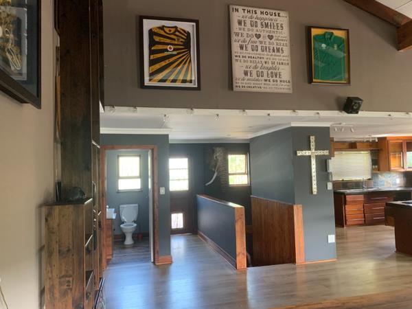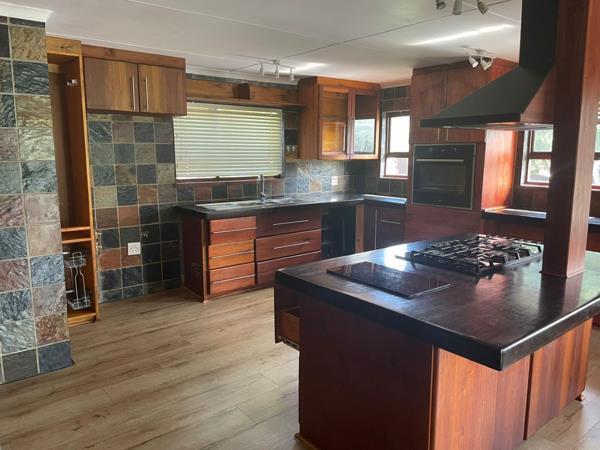 The main living area features an open-plan lounge, dining space, and kitchen that lead out to a deck overlooking the swimming pool. The kitchen is equipped with a gas stove and provides ample workspace and storage. Additional spaces include a covered braai area for entertaining, two separate offices ideal for work or study, and a dedicated laundry, all contributing to a well-rounded and functional home.