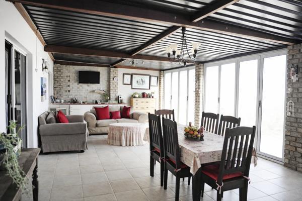 The heart of the home lies in its open-concept kitchen, crafted for functionality and flow, complete with a separate laundry area. An indoor braai space connects seamlessly to a cozy lounge and a large entertainment area, where stag doors open to a private garden oasisideal for memorable family gatherings. A staircase from the garden leads to an elevated deck with breathtaking sea views, perfect for unwinding at sunset.