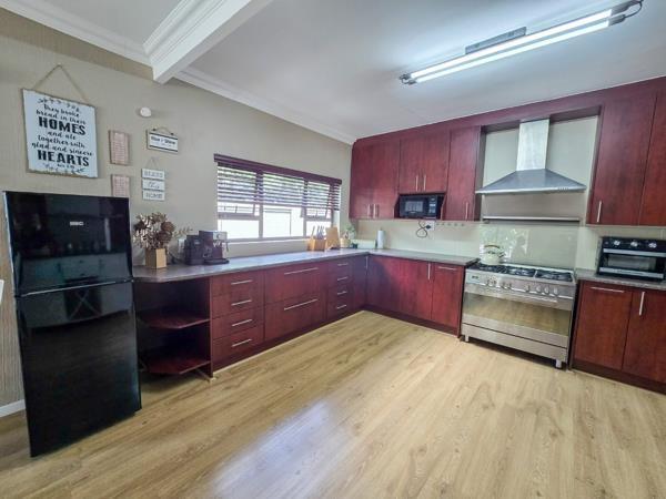 This expansive double storey family home offers exceptional space, versatility and breathtaking views, perfect for large families or those seeking a work from home lifestyle. The upper level provides incredible flexibility and can be used as a home office or converted into a spacious flatlet. It features five rooms and large open plan lounge with a small kitchenette and a toilet with a basin. The main house on the ground floor boasts four spacious bedrooms with build in cupboards, two bathrooms, including a main en suite, a generous lounge and dining area flowing seamlessly into a modern well equipped kitchen with ample cupboard space, gas stove and a separate scullery with a washing machine and dishwasher connection.