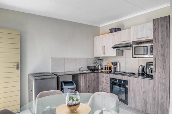 The home welcomes you with a modern, neat kitchen that offers space for one appliance and flows seamlessly into the open-plan living and dining area. Sliding doors lead out to a sunny patio perfect for morning coffee or relaxed evenings.