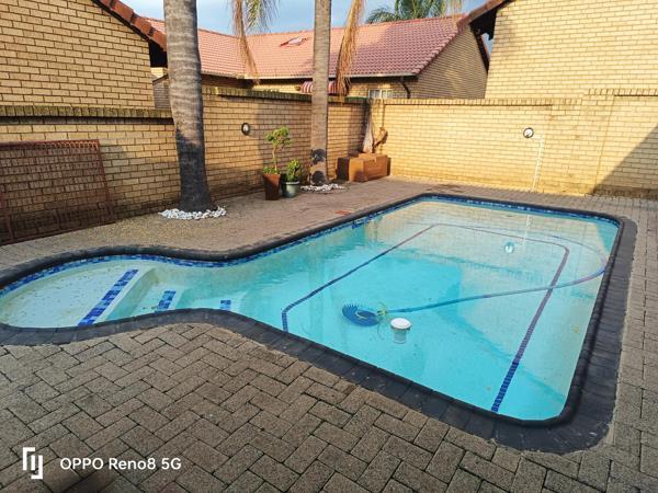 This beautiful townhouse offers luxury living with a jacuzzi, swimming pool, and an entertainment patio featuring a built-in braai and bar, all overlooking a private garden.