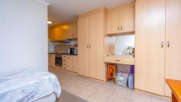Embrace your golden years with ease and comfort in this charming bachelor retreat, ideally situated on the second floor with convenient lift access. Nestled within a serene and picturesque village, it offers the perfect harmony of tranquillity and convenience. The entrance leads to a modern tiled kitchen with sufficient storage, a Defy stove and oven, space for one wet appliance, and room for a bar-size fridge. The open-plan carpeted living and sleeping area easily accommodates additional furniture whether a desk, wing-back chairs, or a small dining table and flows effortlessly onto a private balcony, perfect for enjoying fresh air and quiet moments. The bathroom includes a shower, basin, and toilet. Designed for simplicity and low-maintenance living, this unit allows you to make the most of the finer comforts the village provides.