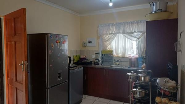Step inside to a comfortable and functional interior, featuring an open-plan layout that enhances the sense of space. The lounge area, ideal for relaxation or entertaining, boasts easy-to-maintain tiled flooring and modern window blinds for optimal light control. The well-appointed kitchen, also tiled, offers practical wooden base cabinets and ample space for meal preparation, flowing seamlessly into the living areas.