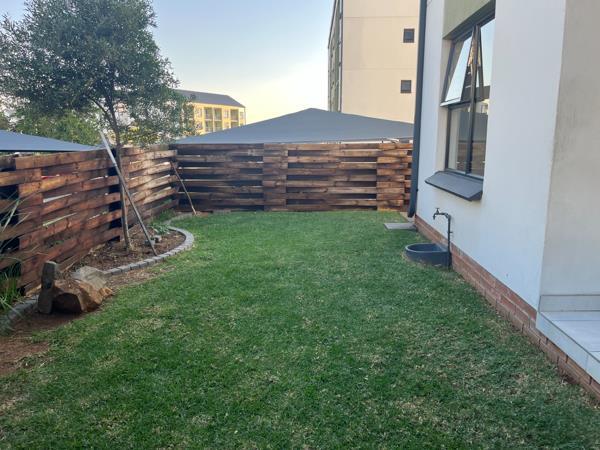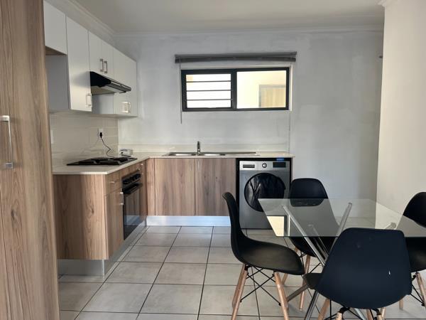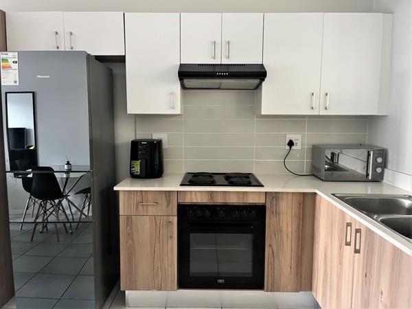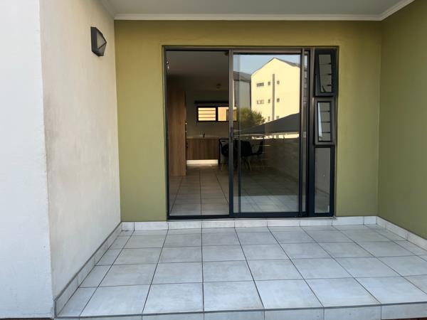 Beautiful ground floor south-west facing, corner apartment offers the perfect lock up and go experience. Front door welcomes you into this spacious open plan home. The kitchen sports high ceilings with modern lighting and includes white Caesar stone countertops, Defy 600 countertop hob, extractor fan and under counter oven and built in cupboards. Space for fridge and under counter washing machine. Lounge is light and cool, with a sliding door onto well-proportioned patio and garden with paved walk around corner to side gate. Main bedroom presents a large picture window with view over the garden, built in cupboards and plugs with USB ports and en-suite bathroom excites with modern bath, large medicine cabinet, toilet and basin. Second bedroom enjoys built in cupboards and picture window overlooking complex. Second bathroom offers large glass encased shower, toilet and basin plus another large medicine cabinet.