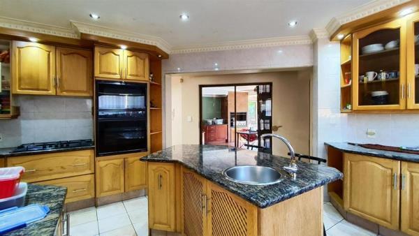 Upon entering, an inviting entrance hall leads to well-defined living areas, including a dedicated lounge, a dining room, and a family TV room, providing versatile spaces for relaxation and entertainment. The heart of the home is a large kitchen, featuring extensive wooden cabinetry, durable granite countertops, a central island with an integrated sink, a double wall oven, and a gas hob. This functional space is designed for both everyday meals and hosting.