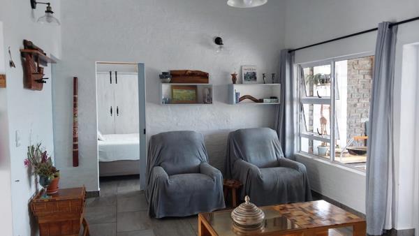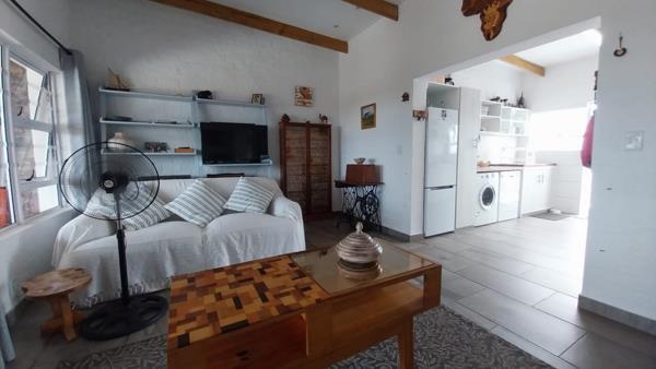 The home offers two bedrooms, both with ample built-in cupboards. The main bedroom enjoys sea views, while the extra-large second bedroom is currently configured to accommodate both a double and single bed, separated by a freestanding cupboard divider. This room also features built-in cupboards and an ensuite toilet with basin, and is large enough to be adapted for various layout options. An extra-large single garage with a brand-new automated door provides secure parking, additional storage, and workshop space.
