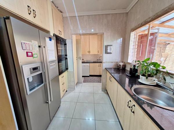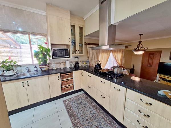 The stunning kitchen with ample granite work tops, a large pantry, gas stove, cooker hood, double eyelevel oven and scullery area. The Laundry is situated under to covered court yard. There is also space for a double door fridge. The kitchen overlooks the TV room very practical!