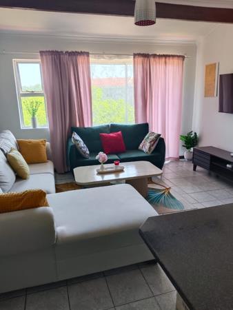 - Lounge area bathed in natural sunlight with a sliding door with views of the pool and braai area