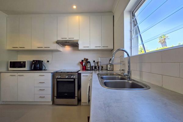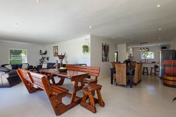 The open-plan lounge and dining area flow through stack-away doors to a lush, green garden. The spacious kitchen with a center island offers ample cupboard space and room for appliances, and approved plans allow for enclosing the back patio to enlarge the bathroom and add a scullery.