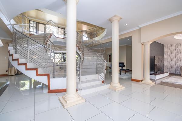 Magnificent portico entrance with a striking porcelain-tiled, dual-lit staircase leading to the upper level
