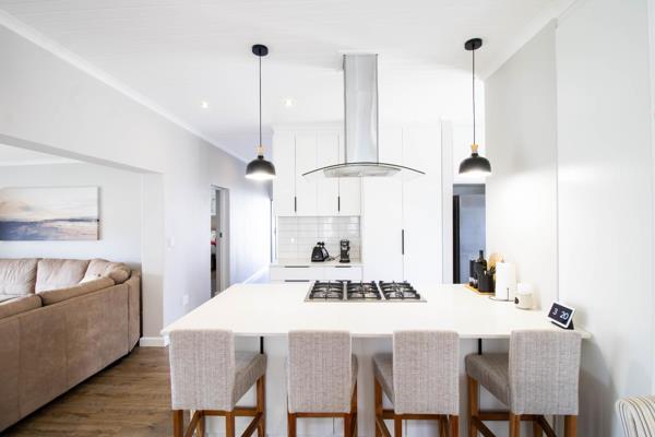 The heart of this home is its sun-drenched open-plan living area, where the kitchen, dining room, family room, and braai room flow seamlessly into one another. Both lounges open onto the garden through expansive glass doors, creating that effortless indoor-outdoor lifestyle that makes coastal living so special. Step outside to your covered patio with a convenient fold-away awning, the perfect setting for alfresco dining and relaxed gatherings with ocean breezes in the air.