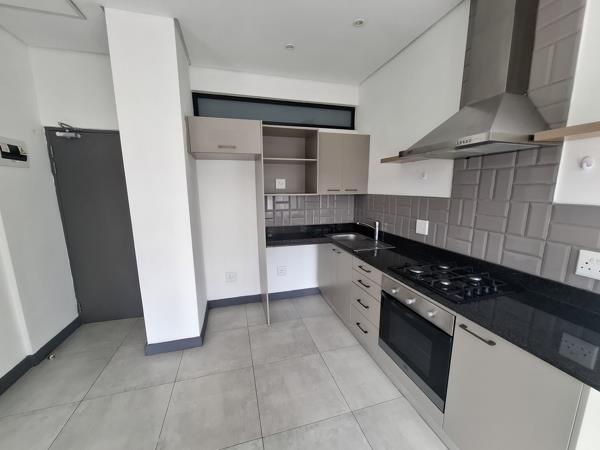 The kitchen boasts sleek modern finishes, a trendy black tiled backsplash, a gas hob perfect for load-shedding, and space for one under-counter appliance.