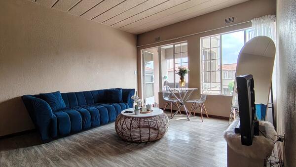 Positioned in the last block at the rear of Eden Terrace, this north-facing first-floor apartment offers privacy and peaceful living away from internal traffic. The bright, airy open-plan lounge and kitchen create a welcoming flow, with fitted cupboards, glass hob, oven, and space for one appliance and a single-door fridge. The lounge opens onto a private balcony, perfect for morning light and fresh air. All three bedrooms are well-sized with built-in cupboards, while the main bedroom enjoys warm north-facing sunshine. A full bathroom completes this practical and comfortable layout.