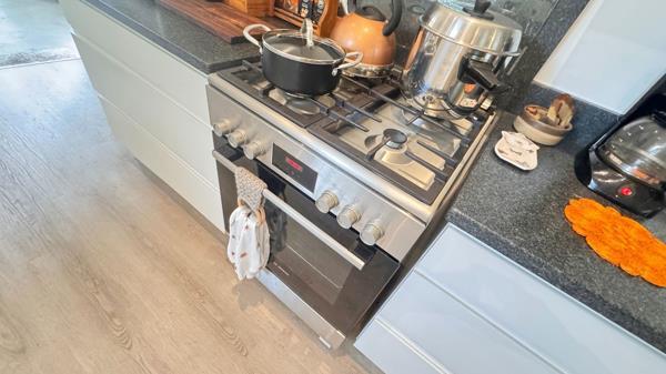Inside, the space is light and airy, featuring high ceilings, clean all-white interiors, and stylish vinyl flooring throughout. The open-plan living and kitchen area flows effortlessly onto an inviting braai area and sun-drenched stoep, fitted with white sliding, north-facing windows that frame tranquil garden views.