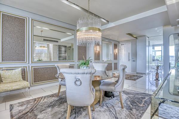 From the moment you enter, you are welcomed by expansive open-plan interiors framed with bespoke wall detailing, oversized mirrors and designer lighting. The grand dining space, anchored by a sculptural chandelier and marble-topped table, flows seamlessly into an opulent lounge designed for both formal entertaining and relaxed living. Floor-to-ceiling glass doors open onto a covered balcony with sweeping views across Sandtons skyline, creating a seamless indoor-outdoor experience.