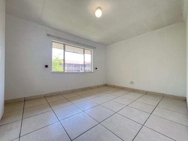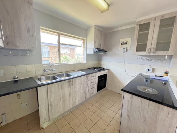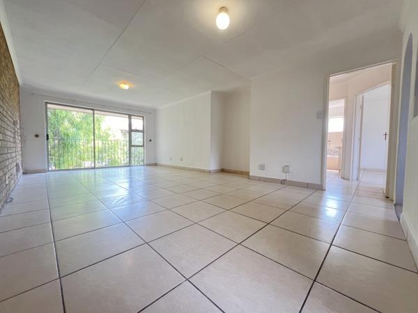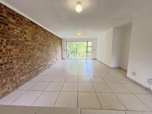 The unit offers a spacious open-plan living area with a well-sized kitchen that flows seamlessly into the lounge. The apartment features tiled flooring throughout, complemented by a stylish face-brick feature wall that adds character to the living space.