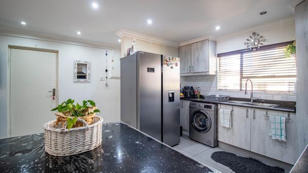 The well-sized modern open-plan kitchen features a gas hob, electric oven, Caesarstone countertops, ample cabinetry, space for water appliances, and accommodation for a double-door fridge. The spacious living area seamlessly extends to a covered patio, wrap-around garden, and built-in braaiperfect for relaxed entertaining and family living.