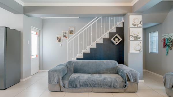On the ground floor, an air-conditioned en-suite bedroom opens directly onto the back patio, overlooking a neat, low-maintenance garden. The outdoor area is perfectly complemented by a splash pool and built-in braai, ideal for enjoying the tranquil surroundings.