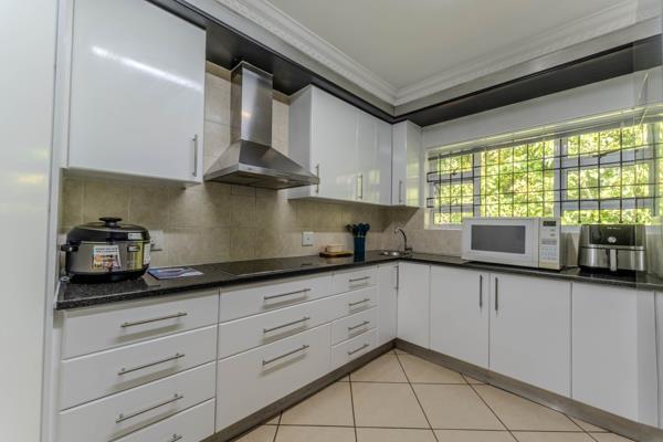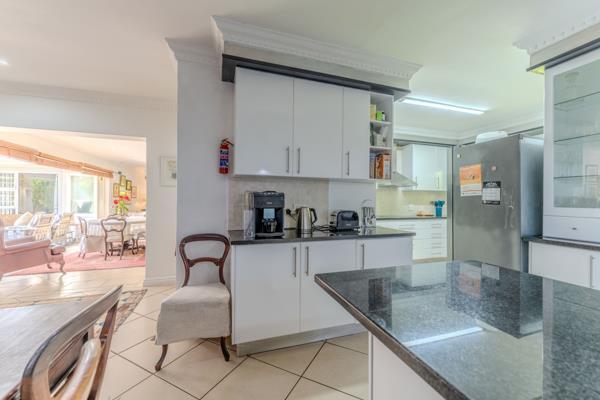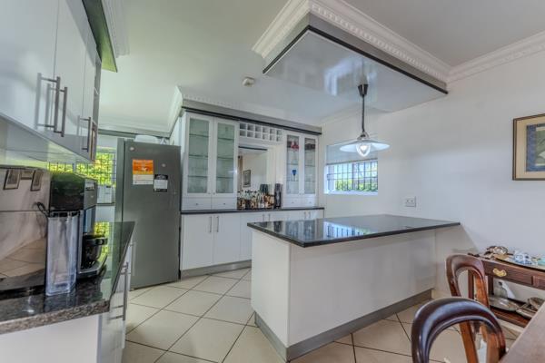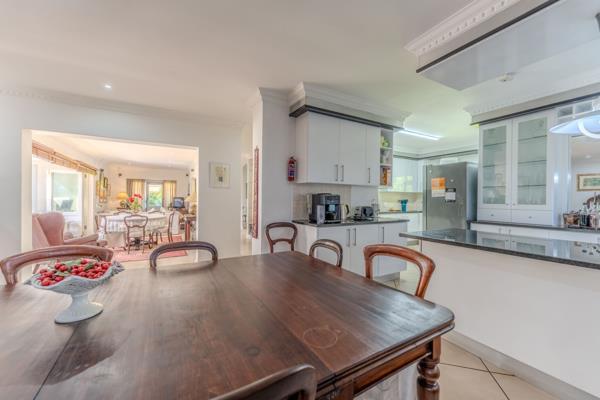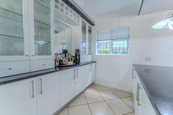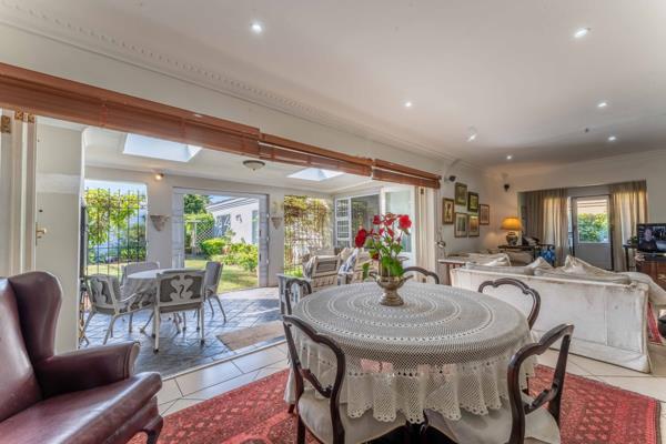 Multiple reception areas provide versatility and scale. The formal dining and lounge areas transition effortlessly into the entertainment spaces, with generous openings that connect the interior to the garden beyond. A signature feature of the home is the enclosed braai and entertainment room, a light-filled space enhanced by two overhead skylights that bathe the area in natural light. This inviting setting opens onto a manicured garden, creating an elegant backdrop for year-round gatherings. The landscaped grounds offer privacy, tranquillity and secure space for children and pets, while ample parking and secure access add peace of mind.