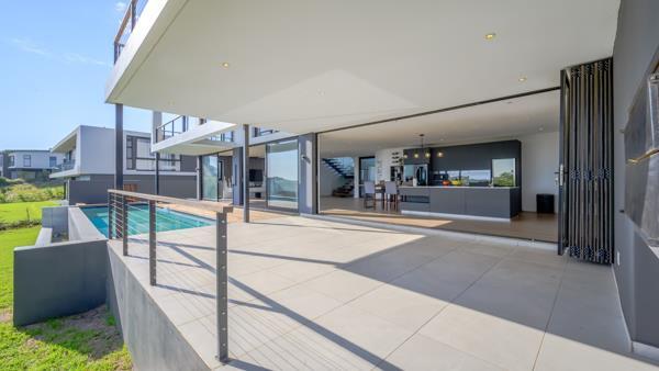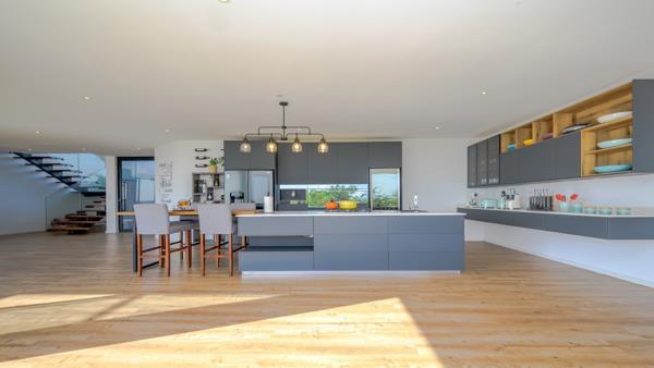 The homes designer kitchen forms the centrepiece of the living space and is fitted with high quality appliances. It flows effortlessly into the open plan lounge and dining areas, creating a bright and welcoming environment for everyday living. A separate scullery adds practicality and keeps the kitchen neat and organised. Large sliding doors lead out to a covered patio with a built in braai, overlooking the swimming pool, the perfect setting for entertaining while enjoying beautiful sunset views.