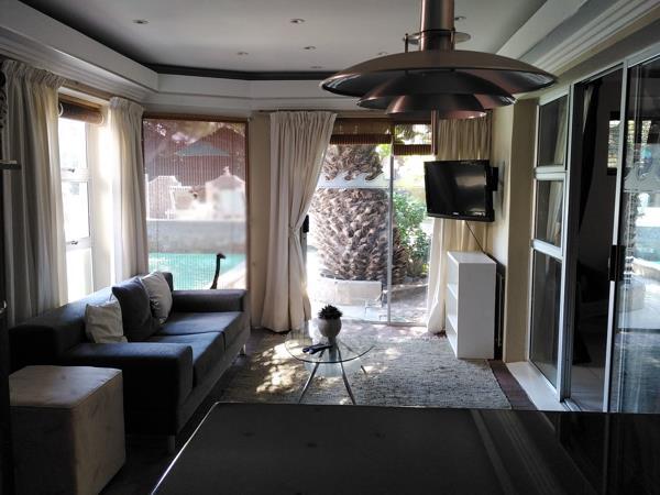 The lounge looks over a lush scenic main garden and pool. Sliding doors has direct access onto its own terrace, furnished with bbq, table and chairs and storage box for the outdoor cushions, set under a large Pepper Tree. the lounge is furnished with comfortable two seater sofa and puffs, coffee table, side tables and a large smart Tv.