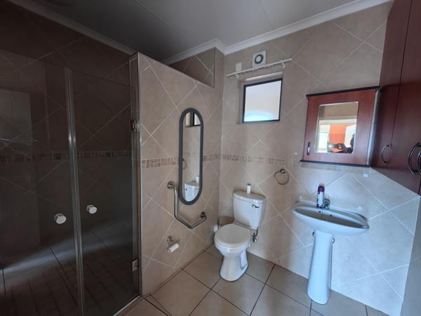 The large bathroom has been designed to be wheelchair friendly with stainless steel handles in the shower as well as next to the toilet.