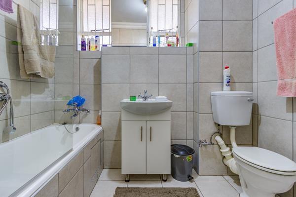 Both generously sized bedrooms are tiled, providing comfort and style. The full bathroom features half tiling and a standard toilet for your convenience. The functional kitchen is equipped with melamine cabinetry, a wooden finish, and a tiled floor, along with an under-counter four-plate stove for easy cooking.