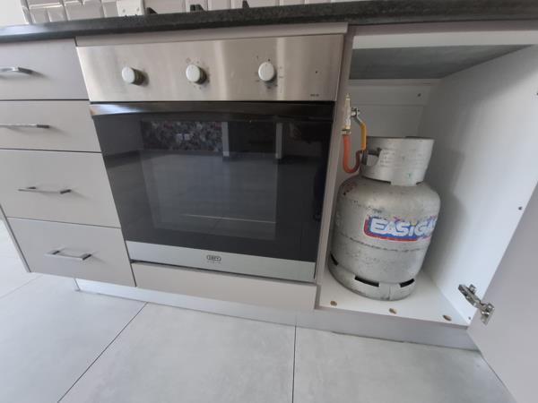 The kitchen boasts sleek modern finishes, a trendy black tiled backsplash, a gas hob perfect for load-shedding, and space for one under-counter appliance.