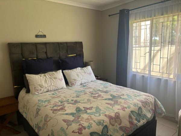 This meticulously maintained two-bedroom residence is situated within a secure complex in New Park, Kimberley. The property presents robust kerb appeal with a secure, paved entrance, complete with a security gate and a tiled-roof canopy. Enhanced security measures, including electric fencing and armed response signage, ensure peace of mind. Ample covered parking, a single garage, and an additional parking bay are available within the premises.