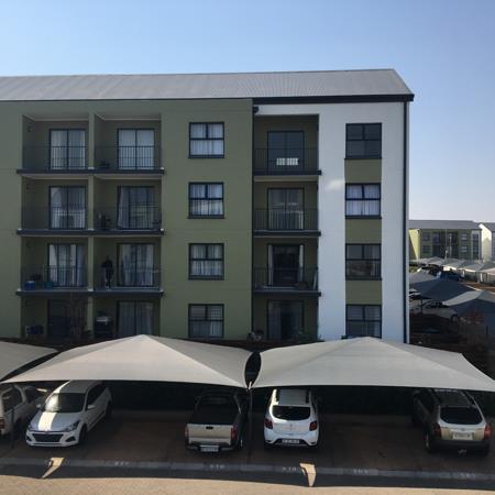 Beautiful, second floor, north-east facing apartment, offers perfect peace, for work from home environment and lock up and go convenience. Spacious open plan kitchen sports modern lighting, white Caesar stone countertops, space for fridge and under counter washing machine, Defy 600 electric countertop hob, under counter oven, extractor fan and built in cupboards. Lounge is light with a sliding door onto balcony with views over complex, communal gardens and adjacent golf course. Main bedroom presents a large picture window with great views, built in cupboards and plugs with USB ports plus main en-suite bathroom sporting large glass encased shower, basin, medicine cabinet and toilet. Second bedroom includes built in cupboards and smaller windows allowing lovely warm morning sun in. Second bathroom offers modern glass encased shower, toilet and basin plus medicine cabinet.