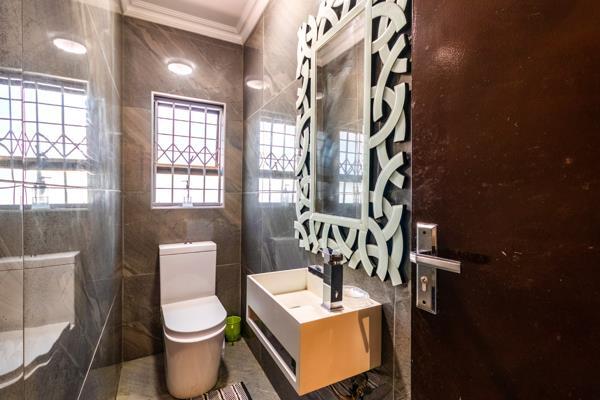 The ground floor features expansive open-plan living areas that flow seamlessly to an enclosed patio with built-in braai, ideal for year-round entertaining. A private study and guest powder room offer convenience, while the well-appointed kitchen boasts granite countertops, a centre island with eat-in option, prep bowls, an electric stove and oven, and space for a double-door fridge. A separate courtyard with washing line and basins completes the practical touches.