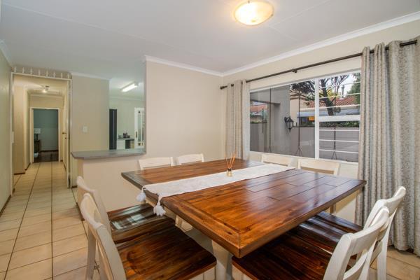 Step inside to an open plan loungedining room with sliding doors opening onto the covered patio, that overlooks the garden and swimming pool area.