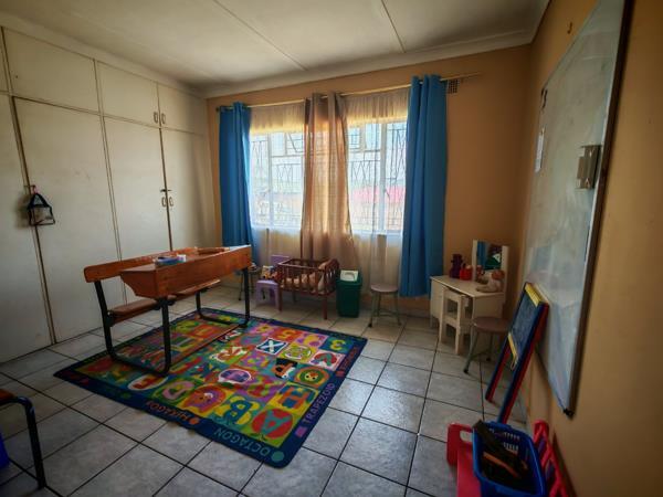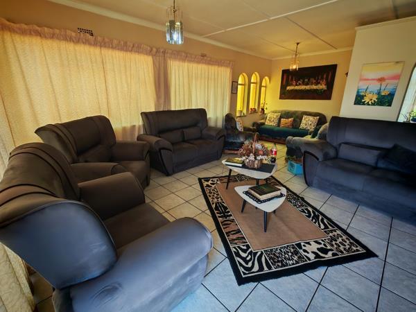 The home features four well-sized bedrooms, all fitted with built-in cupboards, and two bathrooms designed for everyday convenience. A large kitchen forms the heart of the home, complemented by a separate laundry room, while the spacious dining area and expansive lounge create a warm and inviting atmosphere. The lounge is enhanced by distinctive yellow glass windows, adding character and natural light.
