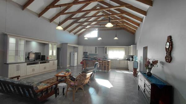 Step inside and be captivated by the striking double-volume ceilings, exposed trusses, and the impressive open-plan living space. This inviting area seamlessly combines the kitchen, dining and lounge area, and is enhanced by a sleek stainless steel indoor braai, ideal for effortless entertainment.