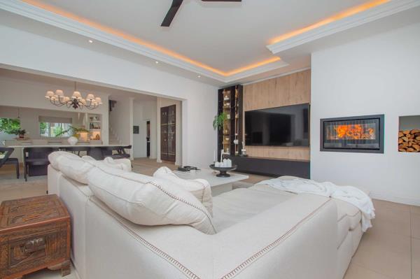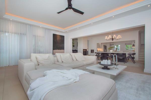 The spacious open-plan living areas feature a beautifully designed and well-equipped kitchen at the center of the home, along with generous lounges, dining, and entertainment spaces, perfect for comfortable family living and seamless entertaining. The high-end finishes include imported Italian floor tiles, premium sanitary ware, an impressive solid oak built-in bar display cabinet, and bulkhead lighting, complemented by overhead Stephen Pikus light fixtures that create a warm ambiance for any occasion.