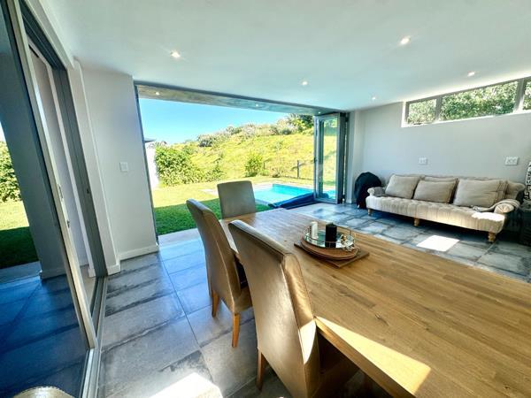 The open plan kitchen, dining and lounge areas flow into the large additional lounge area with sliding doors leading onto the pool. In addition, there is a front patio with lovely sea views.