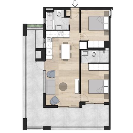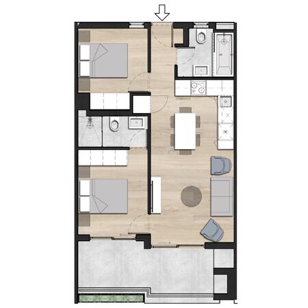 This 51m2 unit has a lovely balcony of 16m2, furthermore, this apartment has 2-bedrooms 2-bathrooms and it will be built with style and comfort according to modern time living. The open-concept design seamlessly connects the living and dining areas, creating an inviting space for relaxation and entertainment. The bedrooms offer ample room for personalization, and the well-appointed bathrooms provide both functionality and aesthetics.