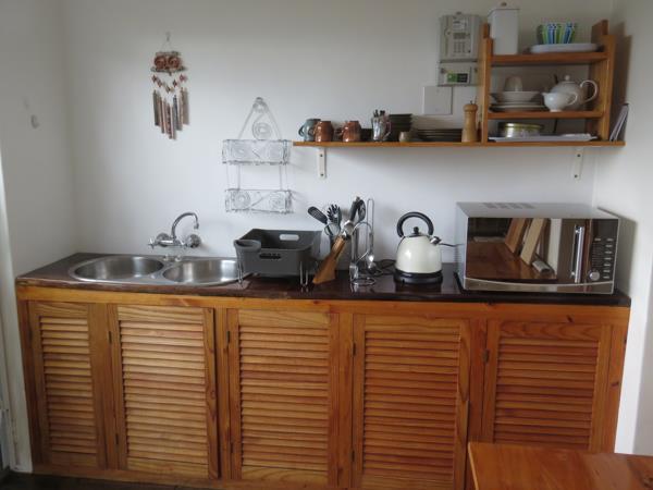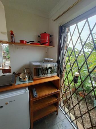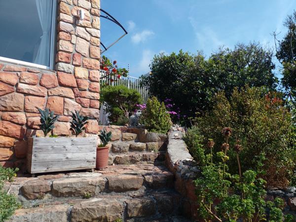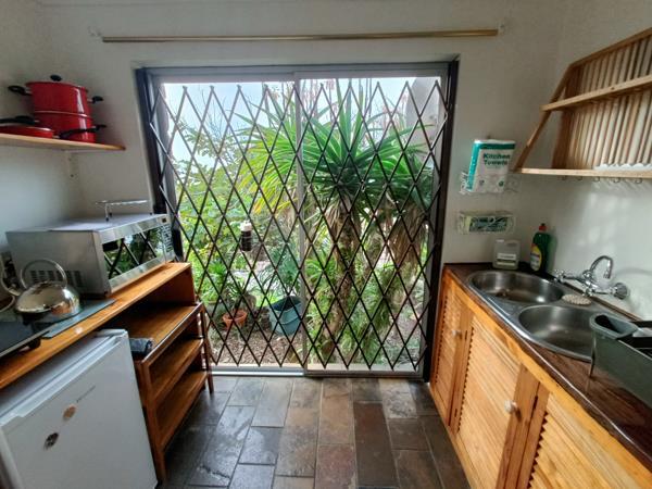 Winding steps lead up to a free standing open-plan light and airy stone cottage with Rosa Stone floor and aluminum picture windows with views of the sea over roof tops and of the mountain behind. Securely fenced in with an electric fence with indoor and outdoor beams and a remote linked to Mountain Men security system and ADT street patrol. Situated at the end of a cul-de-sac on the top half of a single plot up above the main house. Fully furnished with glass sliding doors leading onto a private indigenous garden with outdoor dining area. Features include a bathroom with shower facility and wicker basket drawers. Kitchen with sleeper wood sink top, undercounter fridge, induction cooker stove, microwave grill. Additional laundry facility behind the main house and shared access to a washing line. Bedroomloungedining area includes an Arman plush double bed mattress, bedside tables, hanging cupboard and chest of drawers, antique dining table with 3 riempied chairs, 2 arm chairs and a small coffee table and hammock.