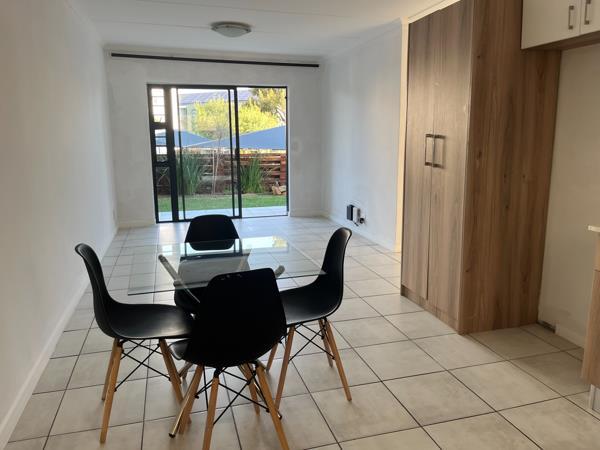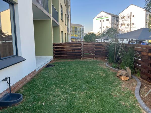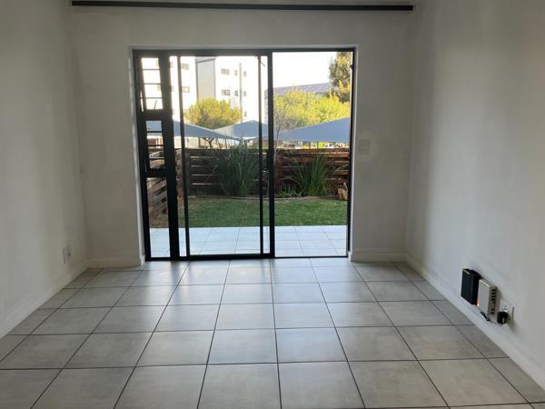 Beautiful ground floor south-west facing, corner apartment offers the perfect lock up and go experience. Front door welcomes you into this spacious open plan home. The kitchen sports high ceilings with modern lighting and includes white Caesar stone countertops, Defy 600 countertop hob, extractor fan and under counter oven and built in cupboards. Space for fridge and under counter washing machine. Lounge is light and cool, with a sliding door onto well-proportioned patio and garden with paved walk around corner to side gate. Main bedroom presents a large picture window with view over the garden, built in cupboards and plugs with USB ports and en-suite bathroom excites with modern bath, large medicine cabinet, toilet and basin. Second bedroom enjoys built in cupboards and picture window overlooking complex. Second bathroom offers large glass encased shower, toilet and basin plus another large medicine cabinet.